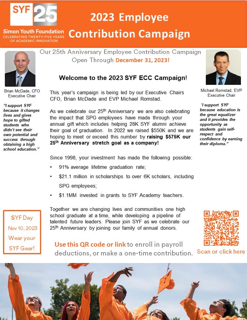 Individual contributors are vital supporters of the foundation helping students in their efforts to reach graduation day! Through the SYF National Educator Conference Circle of Hope campaign, the Simon Youth Academy Network, raised more than $8,000 with the participation of 44 SYF teachers and Academy leaders. Hundreds of new donors mirrored their generosity to SYF in 2023, each of whom played a critical role in SYF’s ability to continue to serve students nationwide.