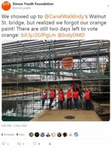 This winter, the Indianapolis Department of Metropolitan Development announced a contest encouraging residents to vote for the future paint color of a bridge that was being remodeled over Indy’s Canal Walk. SYF saw a fun opportunity to encourage local supporters to vote for the color orange. SYF promoted the contest on social media and also took a trip to the bridge and took a team photo to encourage social shares. The contest ran for a couple of weeks, and orange was named the winning color. We are looking forward to having some SYF orange in the heart of our home city!